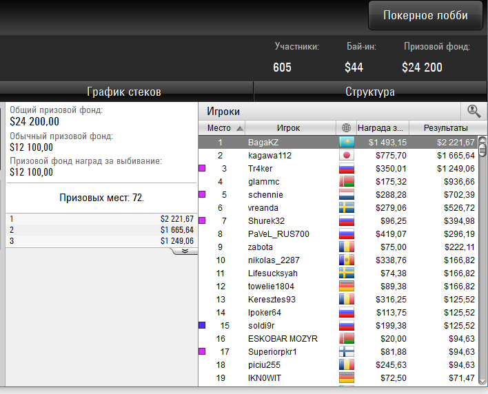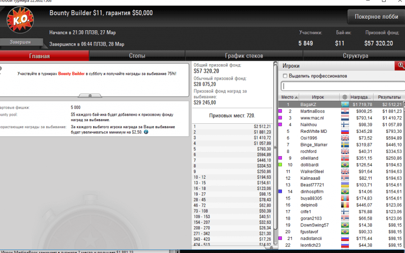 Ещё один занос пришелся также на событие со специальными наградами — Баунти Билдер с бай-ином $11. Здесь стоит отметить огромное поле — почти из шести тысяч покерстов. Нашего игрока это не смутило, и он уверенно занял первое место, получив при этом самые крупный приз за выбивание.