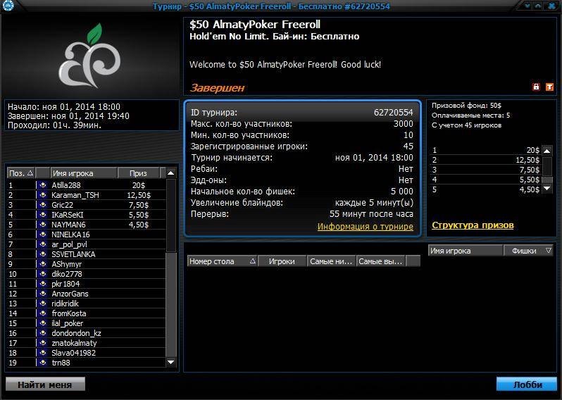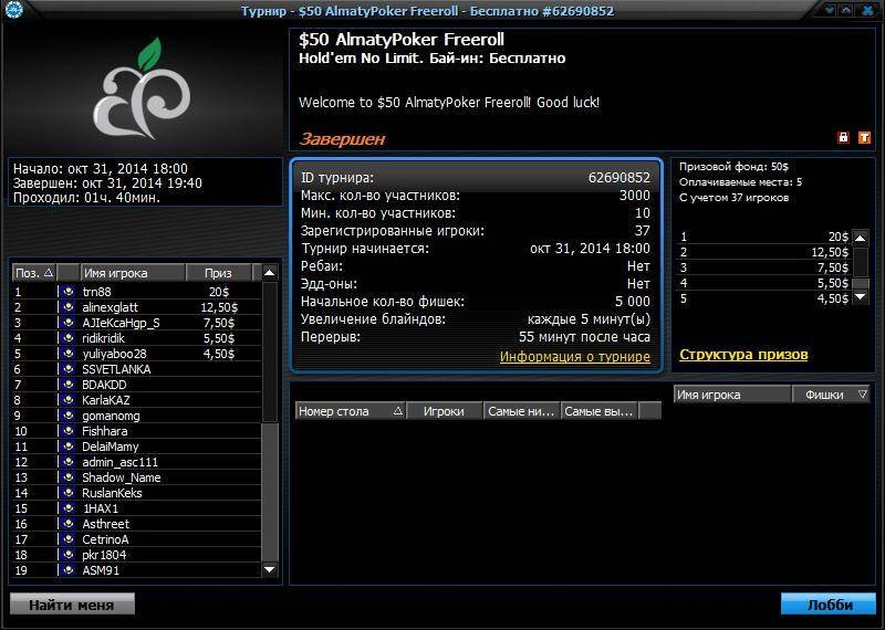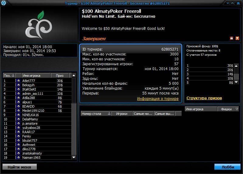А в нашем очередном эксклюзивном фриролле $100 AlmatyPoker Freeroll, где разыгрывались брендированные призы, приняло участие 57 игроков, из которых 8 игроков получили денежные вознаграждения. А игроки, занявшие с 1-го по 5-ое место, получили ещё и дополнительные подарки.