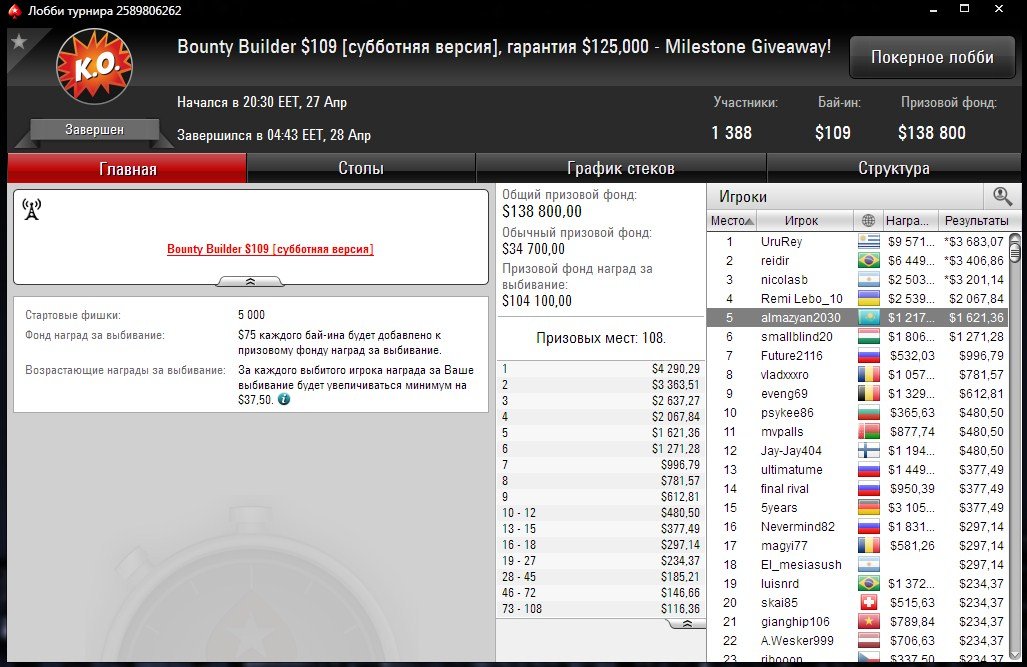 Его призовые составили $2,8К с учетом наград за выбивание.