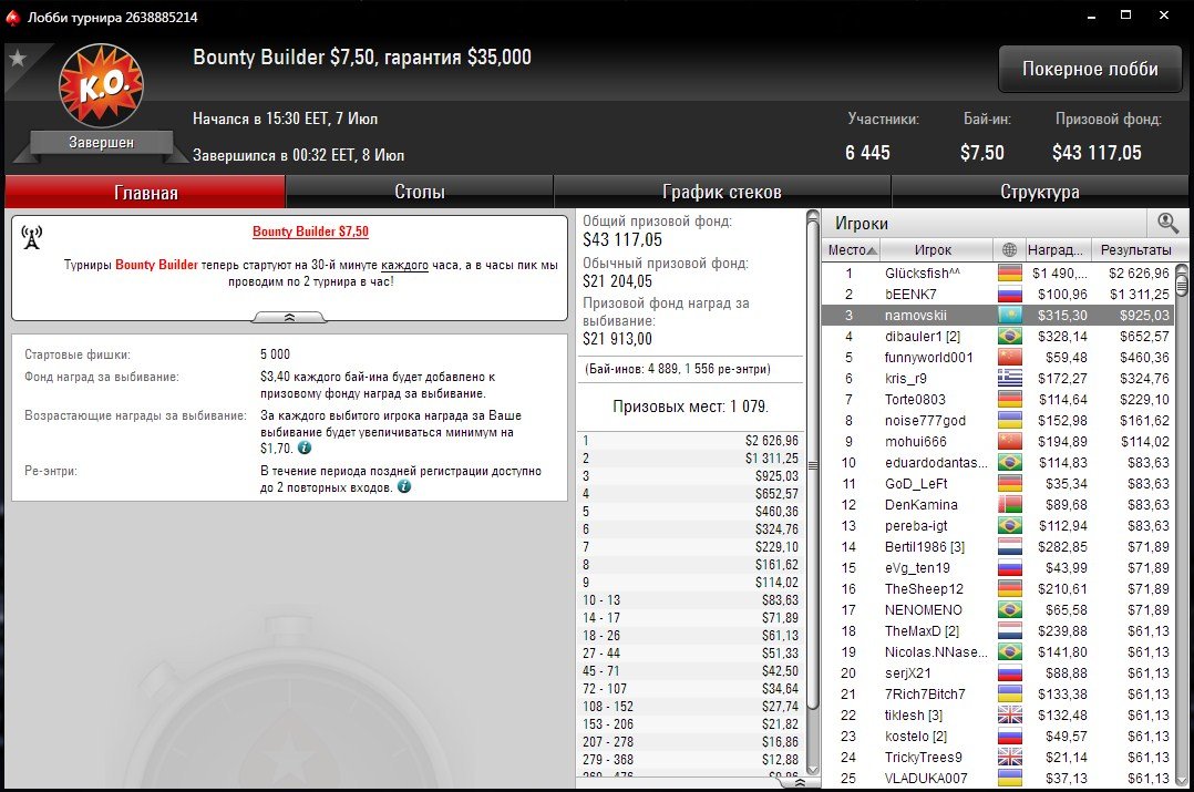 Отличный результат показал “namovskii”. Bounty Builder за $7,5 собрал внушительное поле из 6,445 входов и призовой фонд $43К.