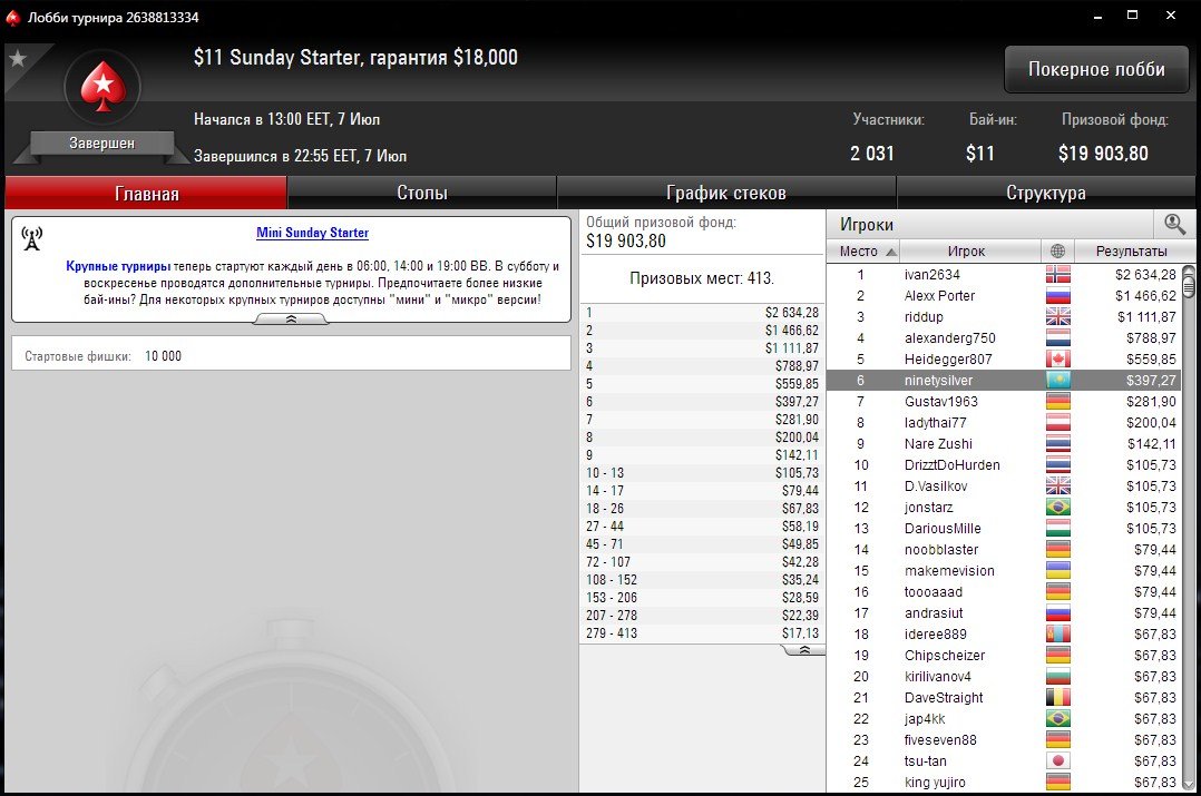 В Sunday Starter за $11, где было сделано более 2К входов, “ninetysilver” остановился на 6-ом месте и заработал $397.