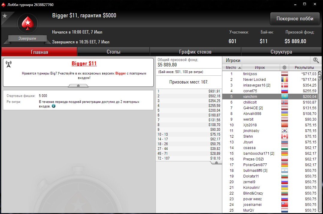 “vanchim” занял 5-ое место в Bigger $11, за что был награжден $200.