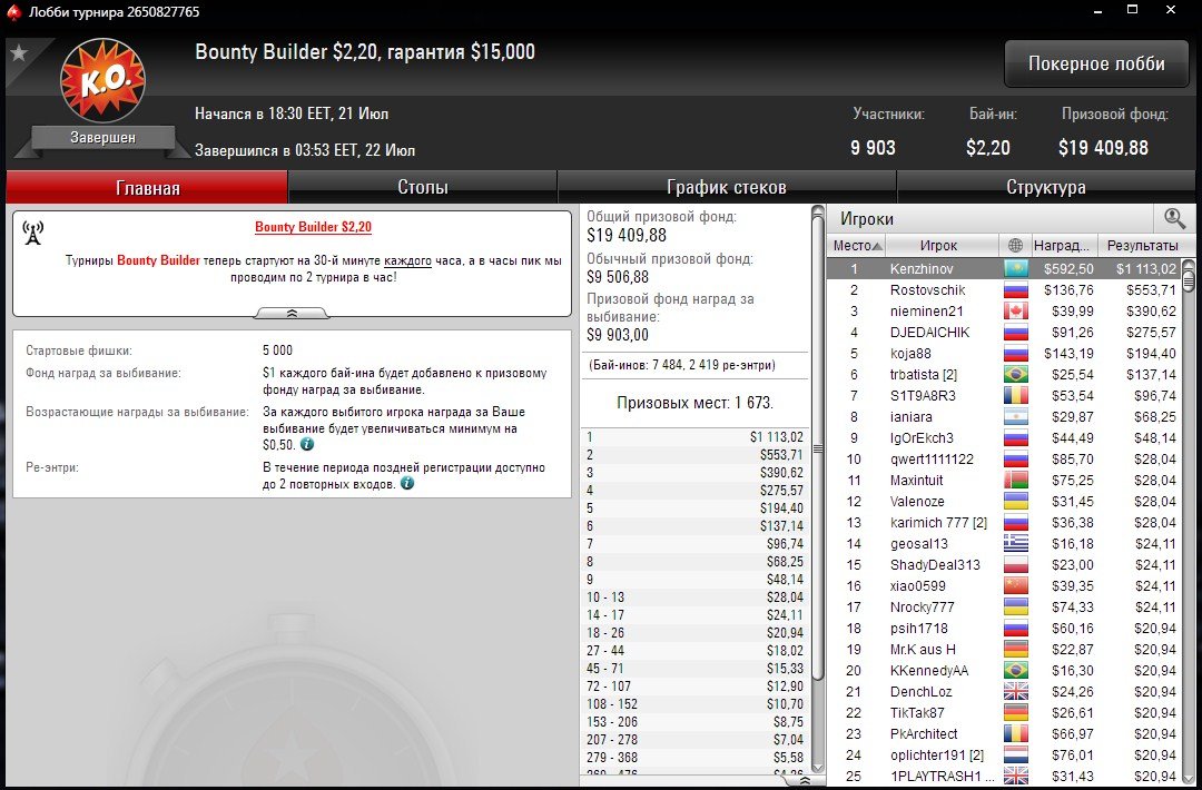 “Kenzhinov” выиграл недорогой Bounty Builder, а также сразу несколько вторых мест у наших игроков в онлайн-турнирах на PokerStars.