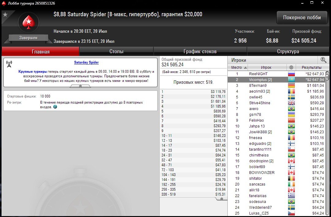 И ещё одно 2-ое место у наших игроков. В гипертурбо турнире Saturday Spider за $8,88 казахстанец “Vicomplus” дошел до хедз-апа, где поделил поровну с российским игроком.