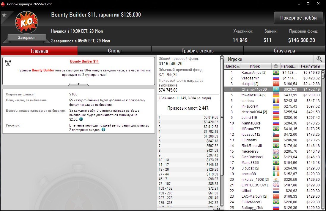 Лучший результат по призовым показал “Champi110700”. Прошедший неделю назад Bounty Builder с бай-ином $11 собрал огромное поле из 15К входов.