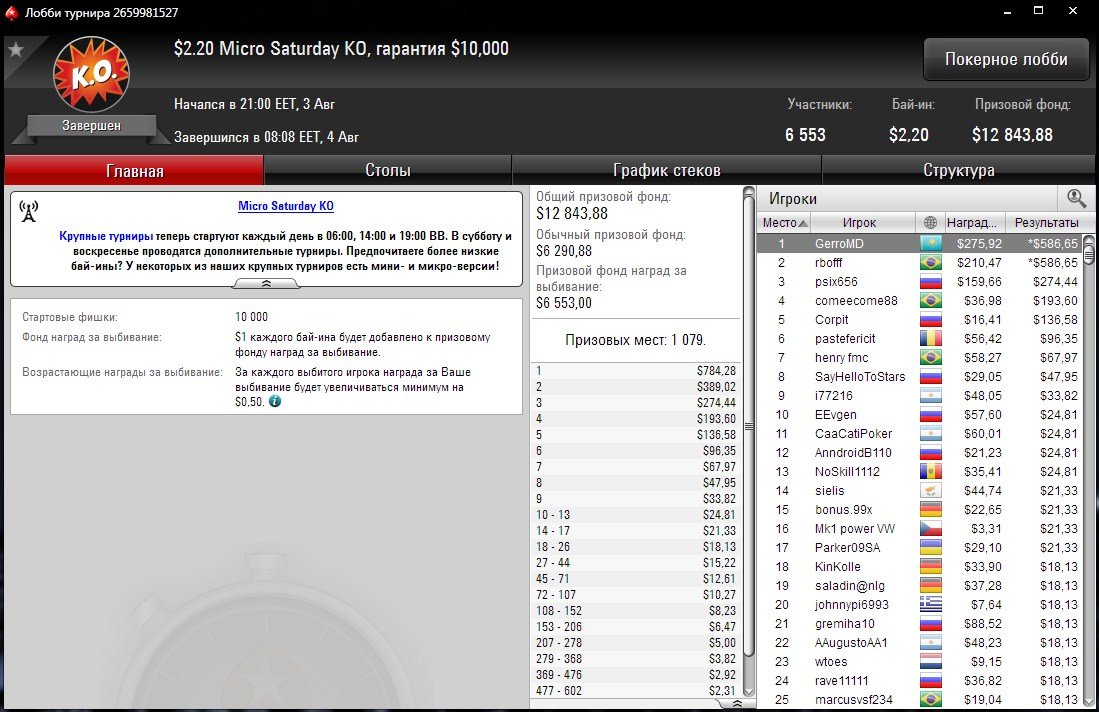 Победой отметился ”GerroMD”, которому удалось преодолеть поле из 6,553 входов турнира Micro Saturday KO за $2,20.