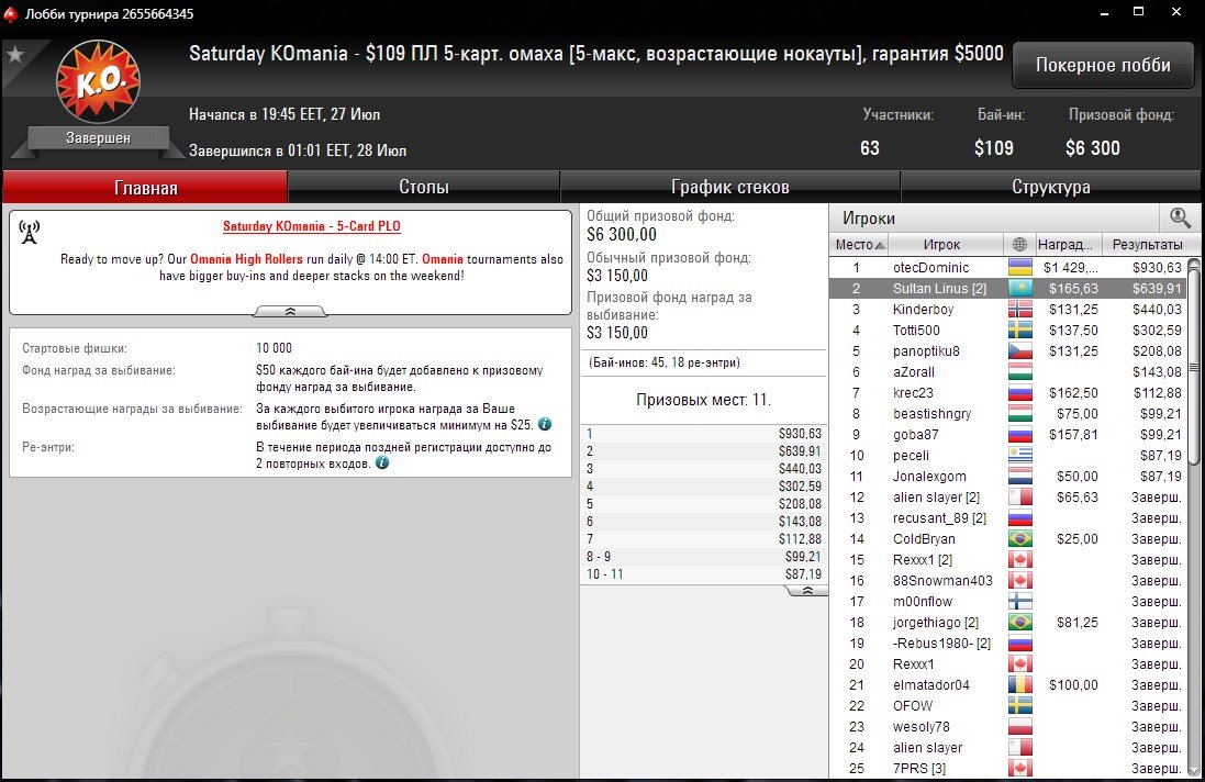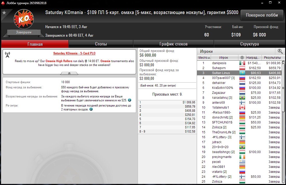 “Sultan Linus” достиг хорошего результата в Пот-лимит 5-карточной омахе с возрастающими нокаутами. Saturday KOmania прошел с бай-ином $109 и собрал 40 участников плюс 20 ре-энтри.