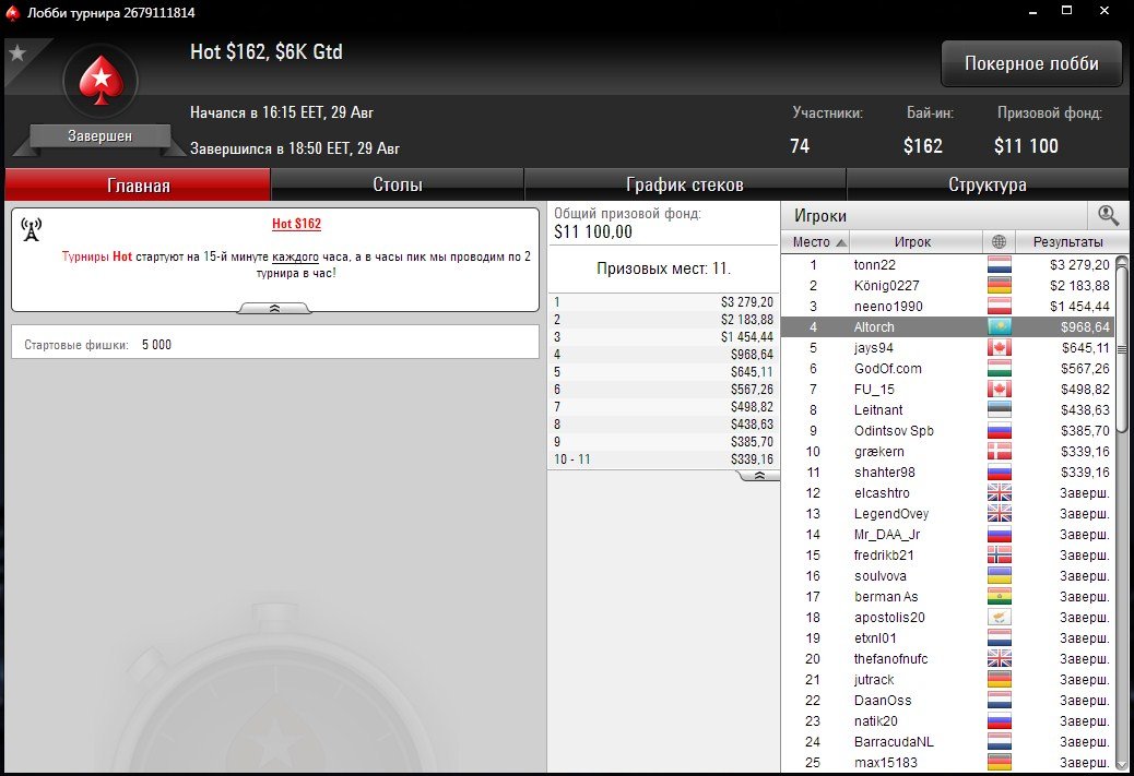 Игроки из Казахстана в течение суток побывали за одиннадцатью финальными столами. “Altroch” отметился финалкой в быстром Hot $162 на PokerStars. Турнир собра…