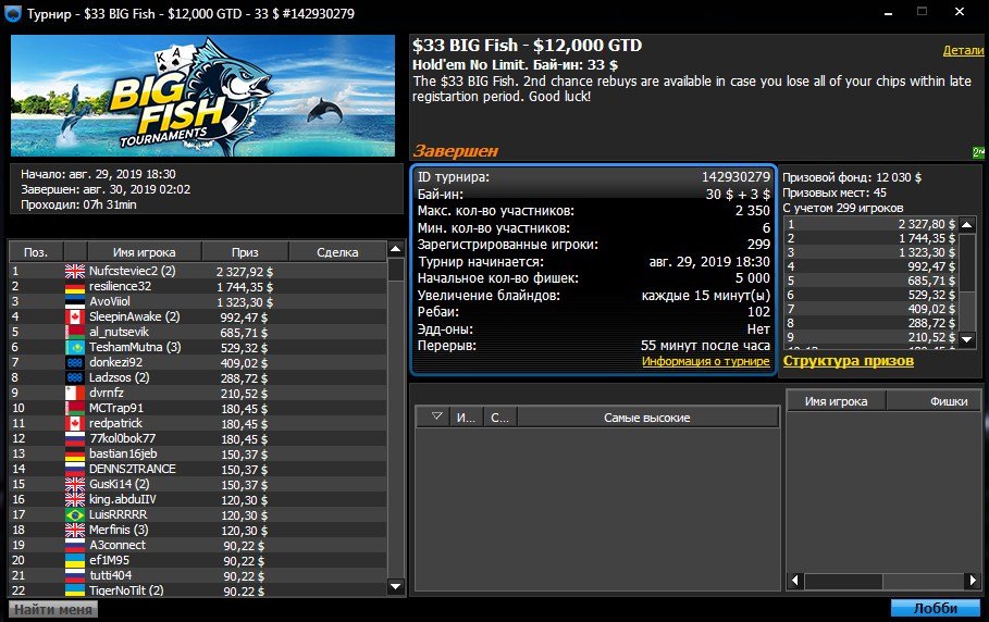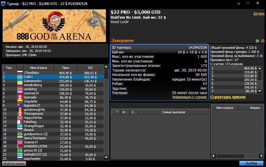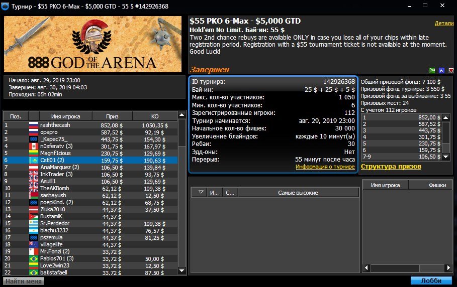 “Olgadurrr” остановился на 6-ом месте и забрал $2,400 с учетом наград за выбивание.
