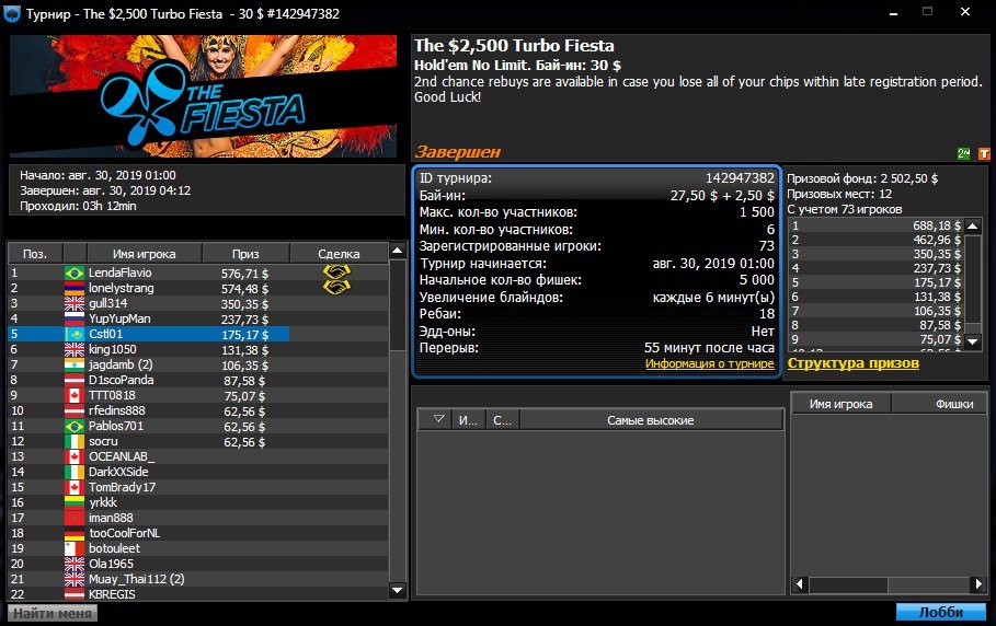 Затем покерист занял 5-ое место в Turbo Fiesta за $30, за что получил $175.