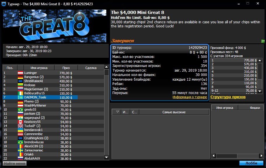 Затем казахстанец сыграл в финалке Mini Great 8 за $8,80, где занял 7-ое место и получил $110.