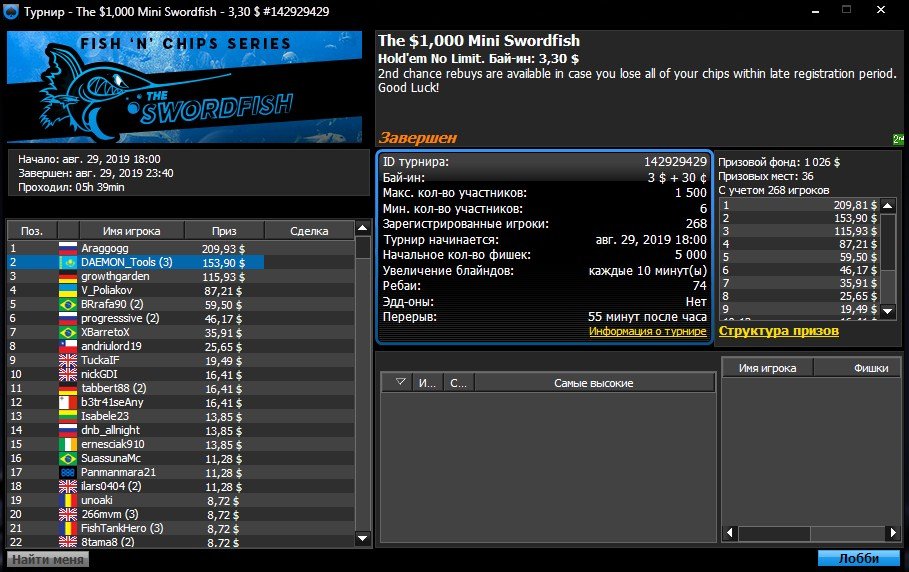 На этом его успехи не закончились. “DAEMON_Too1s” также стал 2-ым на 888poker в турнире Mini Swordfish с идентичным бай-ином.