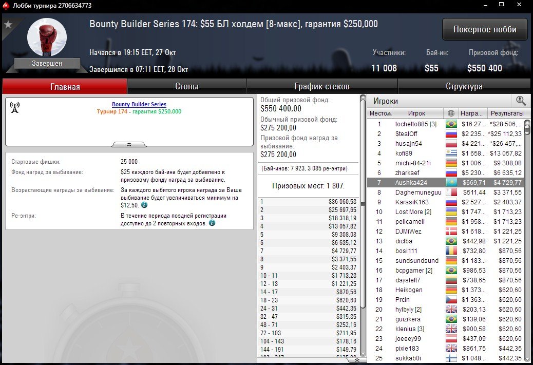 В турнире с бай-ином $55 отличился “Aushka424”.