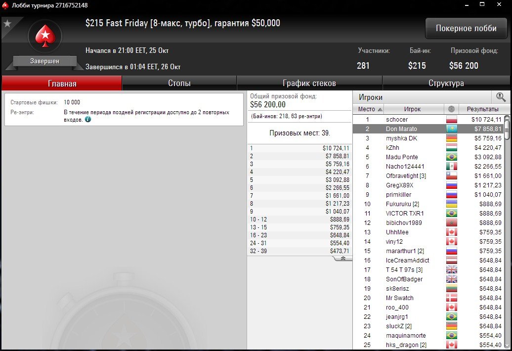 “Don Marato” сыграл за $215 и за 2-ое место получил $7,8К.