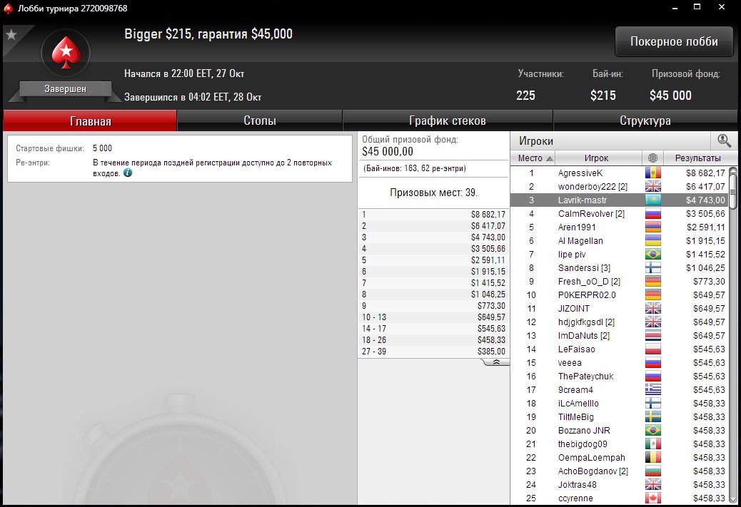 “Lavrik-mastr” отлично показал себя в дорогом воскресном Bigger за $215. В турнире было сделано 225 входов, в том числе 62 ре-энтри.