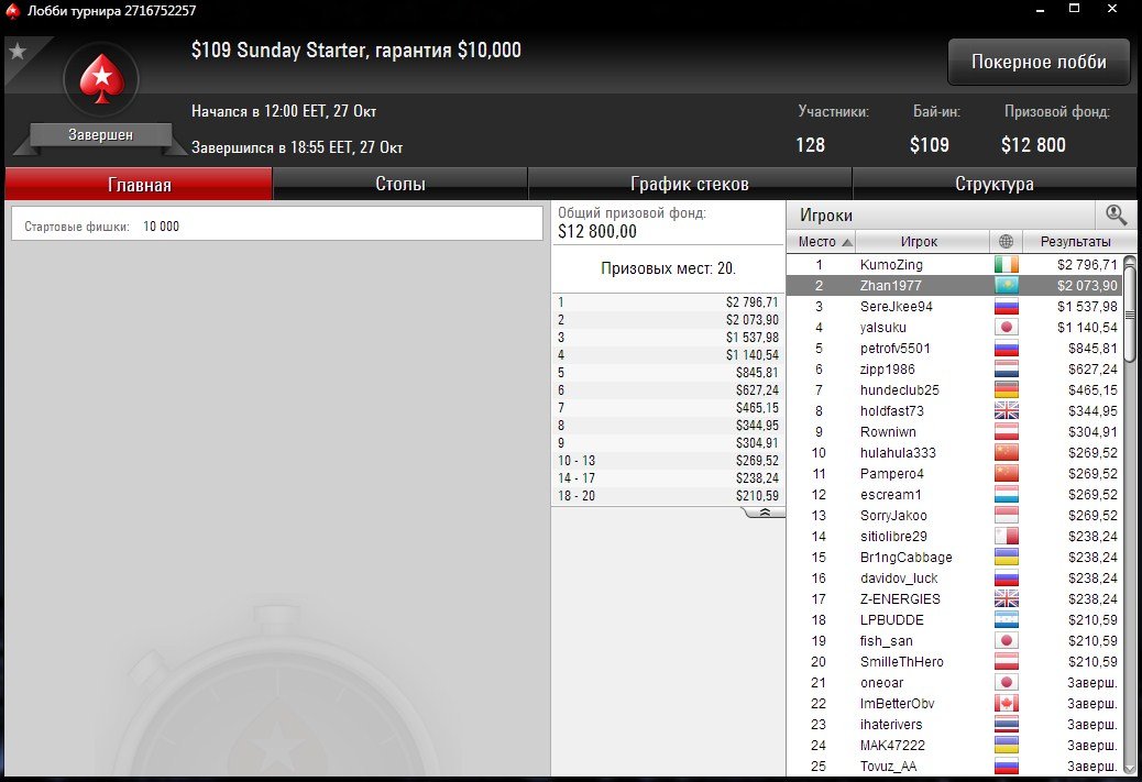 Ещё одно серебро за “Zhan1977”. Турнир Sunday Starter за $109 привлек 128 игроков, тем самым перебив гарантию.