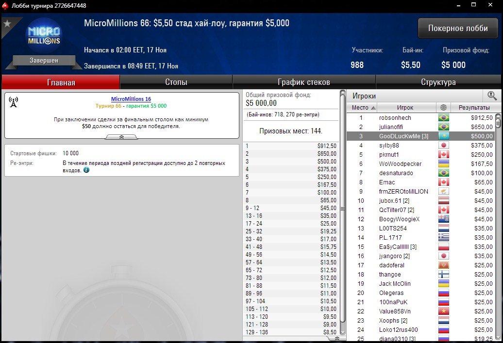 Казахстанец с ником “JohnWADA” стал лучшим в турнире серии MicroMillions по 5-тикарточному Дро-покеру с наградами за выбивание.
