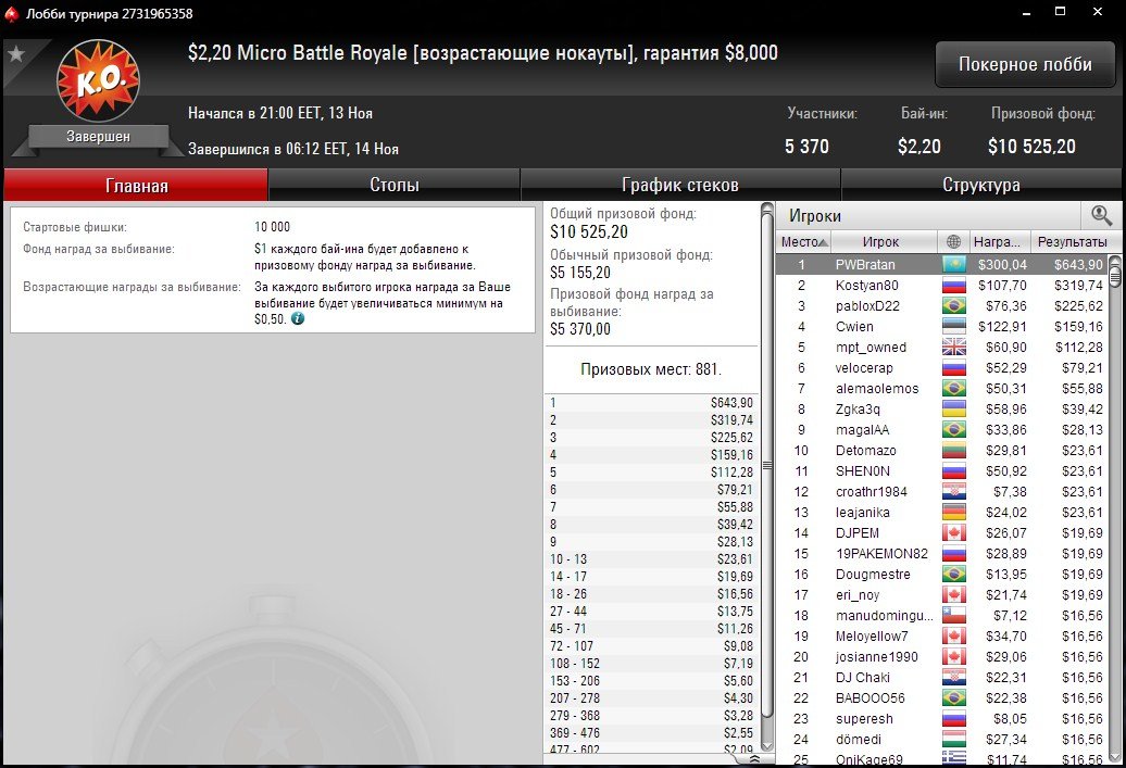 В недорогих турнирах отлично показал себя ”PWBratan”. На его счету победа в Micro Battle Royal за $2,20 и 6 место в MicroMillions по Омахе хай-лоу за $3,30. Оба ивента прошли с прогрессивными нокаутами.