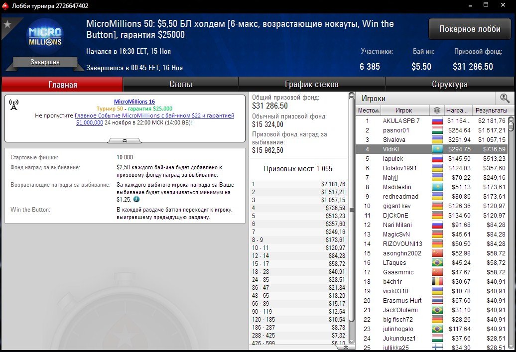 “VIdrKI” отличился финалкой в 6-Макс турнире MicroMillions c бай-ином $5,50 по Холдему с возрастающими наградами.