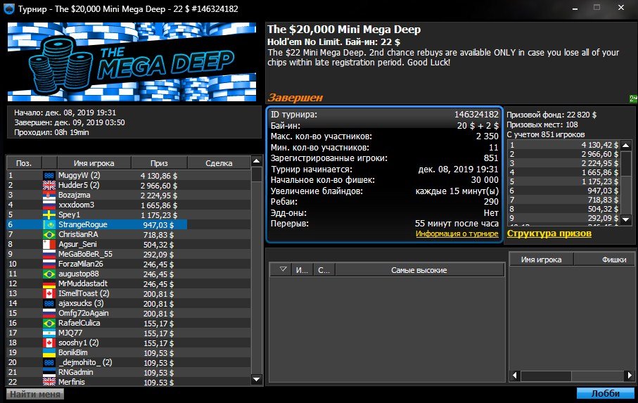Сначала он стал 6-ым в Mini Mega Deep за $22 и гарантом $20К.