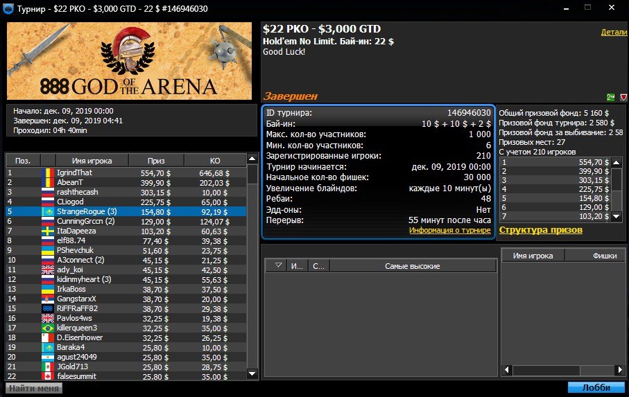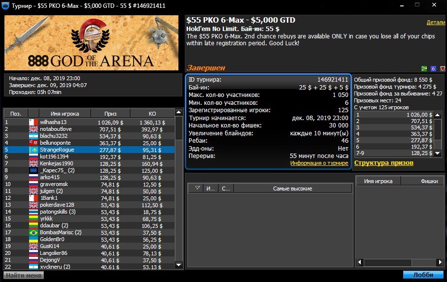 Затем “StrangeRoque” занял два 5-ых места в баунти турнирах с бай-инами $55 и $22.