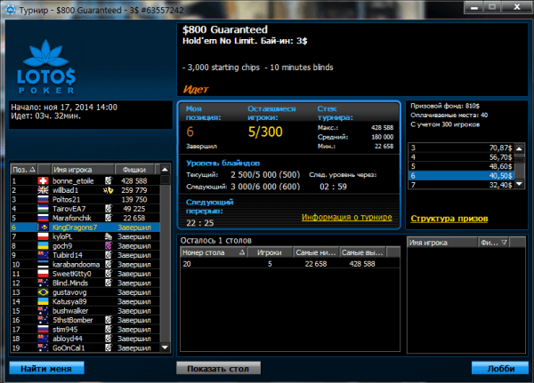 В миллиардном турнире за $109 наивысшее место из всех казахстанцев занял игрок под ником «Wolfffff«. Он получил $920.18 за 312 место. Всего в турнире приняло участие 34081 игроков.