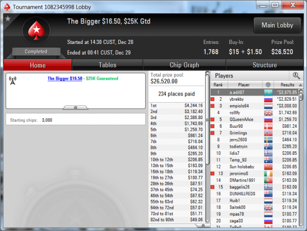 Эта победа Адиля хоть и не входит в даты обзора, но её обязательно стоит отметить. Наш форумчанин под ником «aadil» выиграл воскресный Bigger за $16,5 на PokerStars. Приз составил $3,975.85. Читайте его рассказ о том, как складывался турнир.