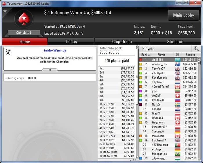 В турнире Sunday Warm-Up на PokerStars сыграло 3135 игроков и призовой фонд составил $627,000 . Два наших игрока попали в призы. Ими стали: «oljazer» — место и $1,191.30 призовых и «tayshi» — 164 место и $645.81.