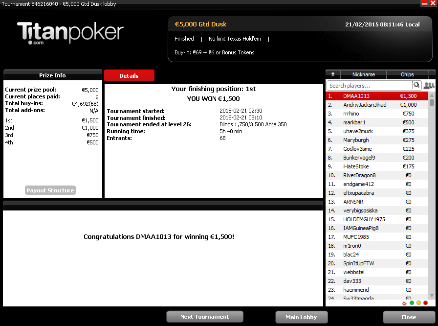 Ну вот и Титан порадовал. В ХА выходил 2 к 1 не в мою, но стеки ппц глубокие были, более 50бб эффективный стек был, поэтому спокойно додавил не сильного оппа. Хорошо еще на 3 месте ушел оч приличный рег, иначе результат был бы другой.