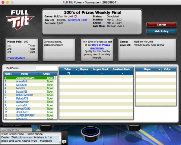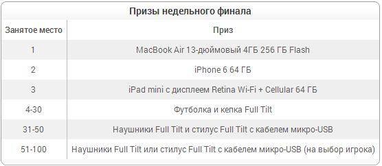 Макбук Василий выиграл в финальном фриролле акции «100 призов от FullTilt«. Напоминаем, что в это воскресенье, 8 марта в 23:00 АЛА, пройдет последний финальный турнир, где разыграют: