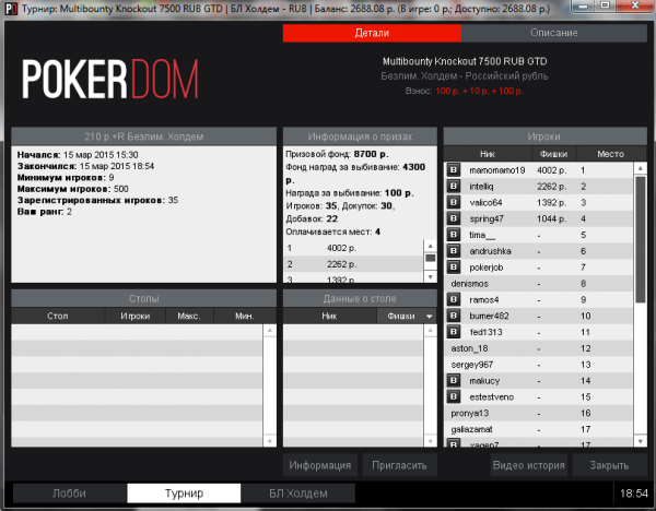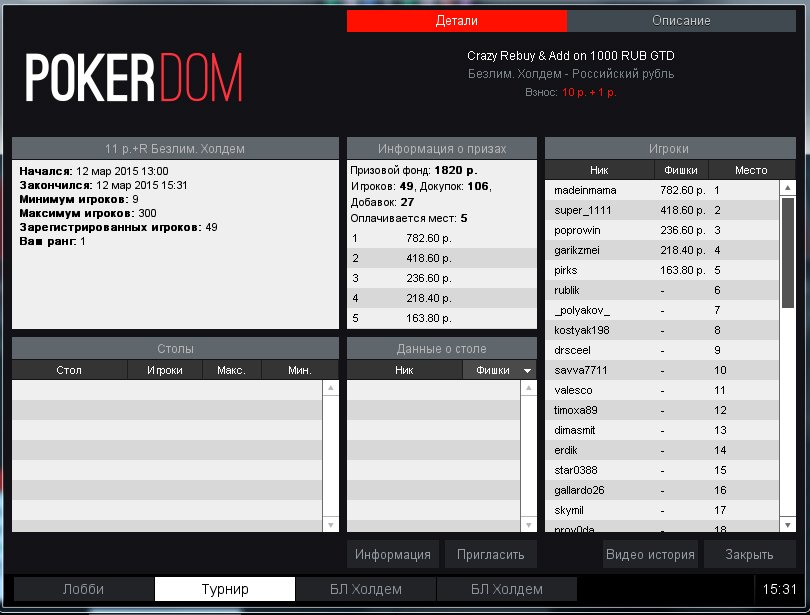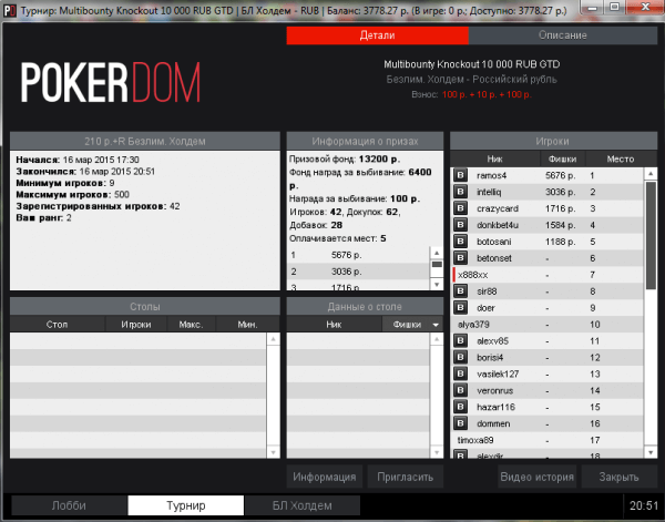 В турнире Sunday Warm-Up на PokerStars приняло участие 2,585 игроков и призовой фонд составил $517,000. Единственным казахстанцем, которому удалось дойти до призов, оказался «CBEPXchel» — за 54 место он получил $982.80.