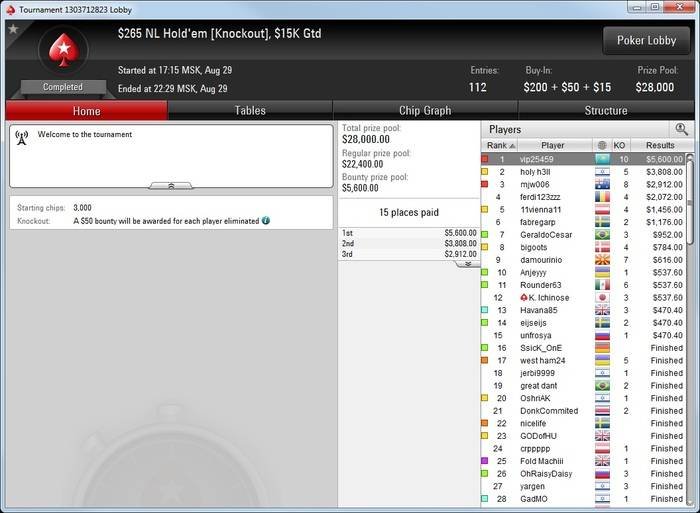 Слава «vip25459«, лучший казахстанский онлан гриндер МТТ, выиграл турнир с нокаутами за $265. Приз за первое место составил $6,150.