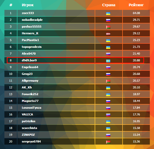 Заработав 20.88 очков, игрок из Казахстана «d9d9.bor9» занимает 8 место.
