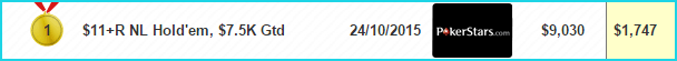 1 место на PokerStars в $11+R NL Hold’em, $7,5K Gtd — $1,747