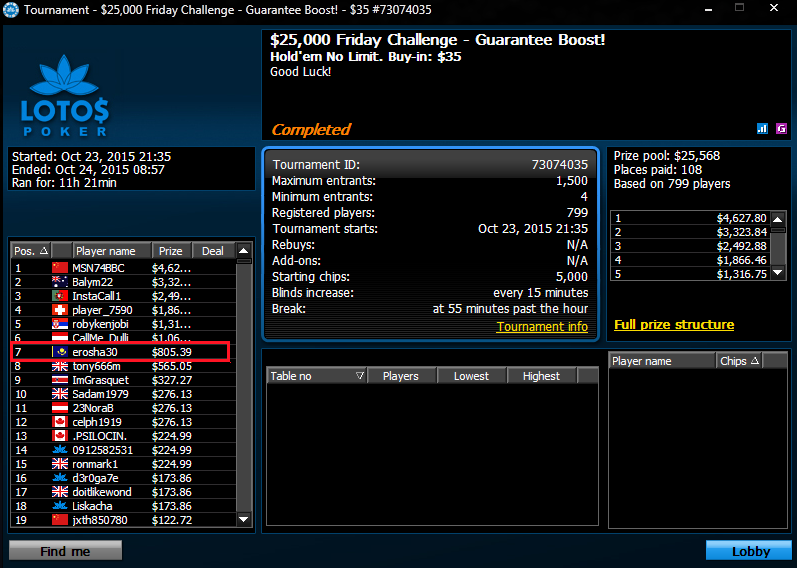 Казахстанец “Erosha30” побывал за финальным столом турнира Friday Challenge на LotosPoker. Он занял 7 место, а призовые составили $805.36.