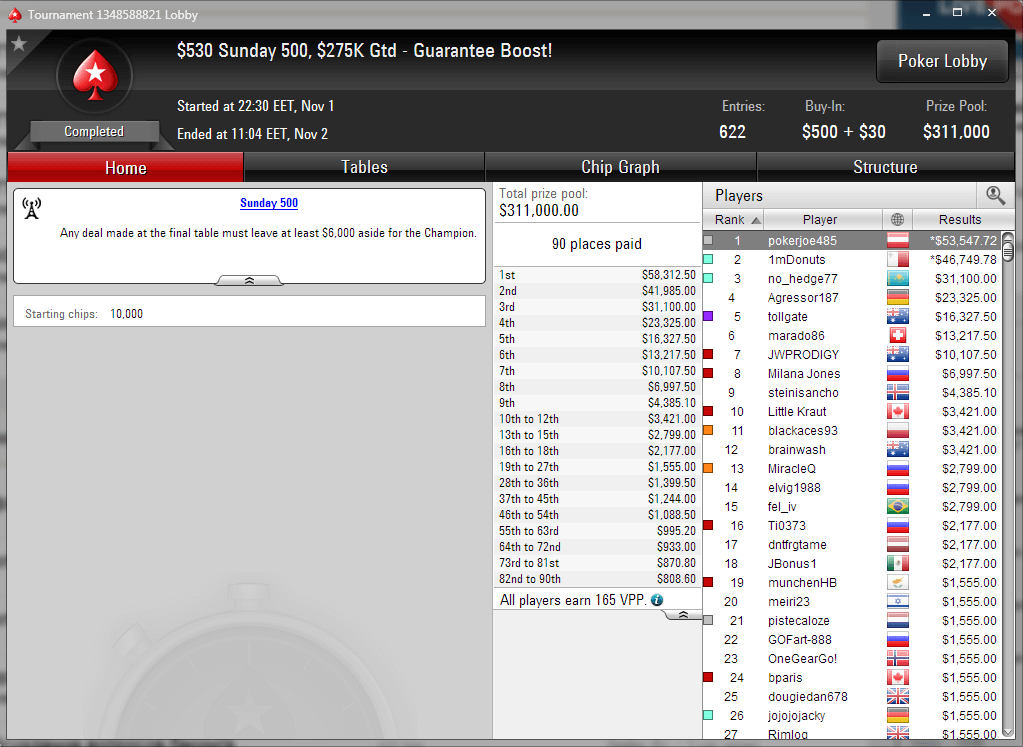 В турнире Sunday Million на PokerStars приняло участие 5,573 игрока, тем самым сформировав призовой фонд в $1,114,600 (первое место — $174,326). Опять, как в прошлое воскресенье, двое наших игроков получили призовые: “Rivera_net” — $345.52 за 668 место и “Nurik78” — $557.30 за 238 место.