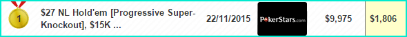 1 место на PokerStars в турнире $27 NL Hold’em [Progressive Super-Knockout] — $1,806