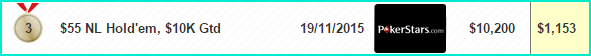 3 место на PokerStars в турнире за $55 — $1,153