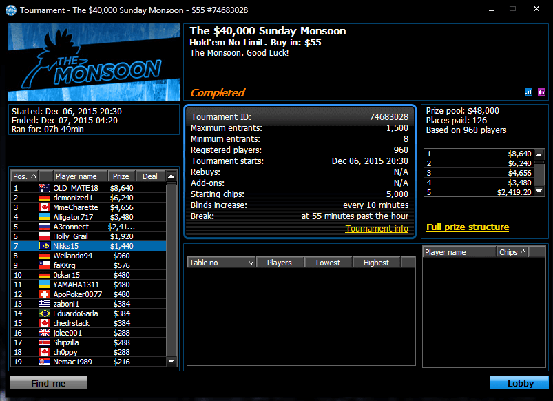 На LotosPoker 7 место в воскресном The Sunday Monsoon занял “Nikks15”. В турнире с бай-ином $55 и гарантией $40,000 участвовало 960 игроков. Призовые казахстанца составили $1,440.