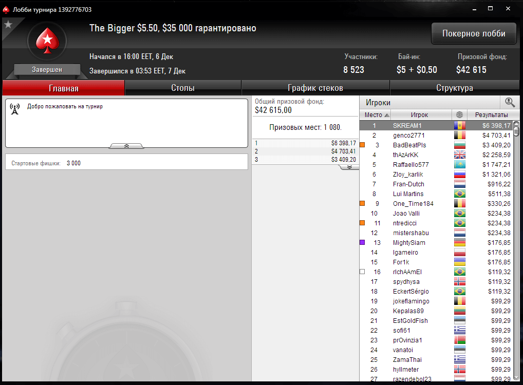 А в Bigger $5,50 “Raffaello577” пришлось преодолеть мегаполе из 8,523 участников турнира, выйти за финальный стол и занять 5 место. Казахстанец получил $1,747.21.
