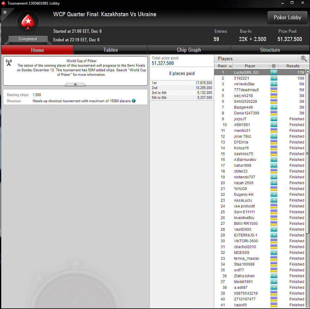 World Cup of Poker 2015 (WCP), который стартовал 22 ноября на PokerStars, пока проходит успешно для Казахстана. Напомним, Мировой кубок по покеру проводится онлайн за условные фишки. Наша сборная преодолела квалификационный раунд, четвертьфинал. А в воскресенье, 6 декабря, ребята обыграли сборную Украину, и тем самым стали полуфиналистами WCP. Отметим и отличившихся казахстанцев, котрый были финалистами, в прошедшем четвертьфинале — “LuckyGIRL GO”, “5192221”, “mrVentoStar” и “Badger449”.