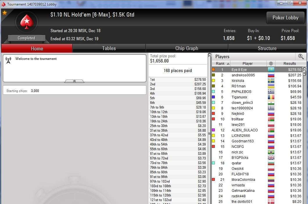 По одному ИТМ в Sunday Warm-Up и Sunday Million, первые места “DelfiNchik”, вторые “vip25459”, успехи “Korbin Dallas“ в турнирах СНГ, победа над килополем «Blackout» и “spa555”.