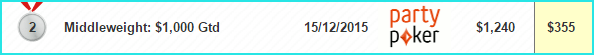 2 место в турнире на PartyPoker Middleweight $55, $1К Gtd — $355