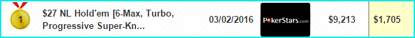 1 место на PokerStars за $27 NL Hold’em [6-Max, Turbo, Progressive SKO), $15K Gtd — $1,705