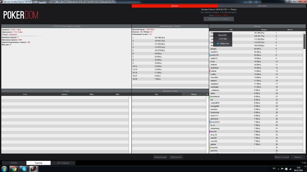 В турнире Sunday Million за $215 на PokerStars только одному нашему игроку под ником “kaskyr777” удалось попасть в призовую зону. В событии приняло участие 5,718 игроков, призовой фонд составил $1,143,600 (первое место — $177,260), а казахстанец занял 133 место и получил $914.88.