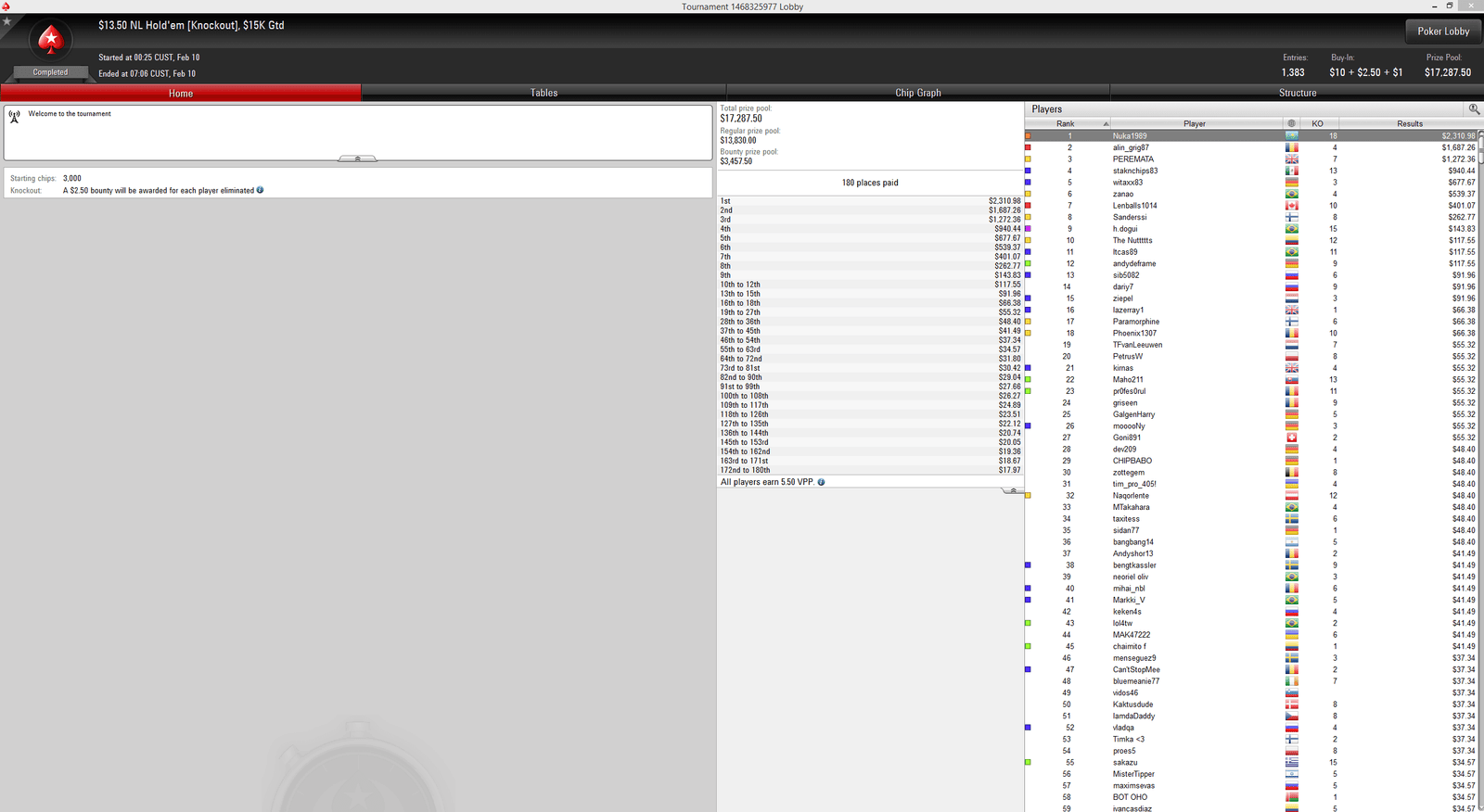 В турнире Sunday Warm-Up за $215 на PokerStars только “vip25459” попал в призы, получив $1,440 за 26 место.
