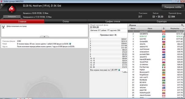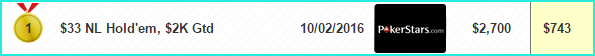 1 место на PokerStars за $33 NL Hold’em, $2K Gtd — $743