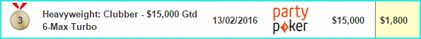 3 место на PartyPoker за $109 Heavyweight: Clubber, $15K Gtd — $1,800