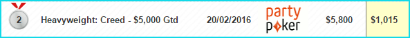 2 место на PartyPoker за $109 Middleweight, $5K Gtd — $1,015