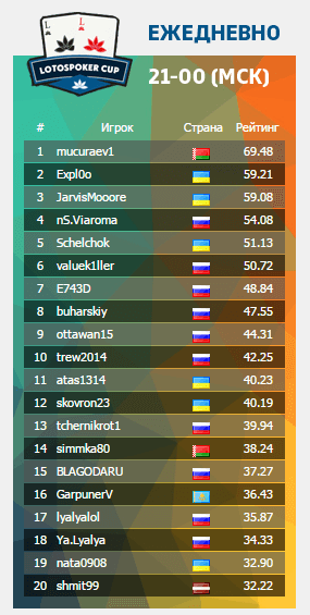 В февральских ежедневных фрироллах LotosPoker Cup в топ-20 сменился игрок из Казахстана. В Таблице лидеров теперь значится «GarpunerV», у которого 36.43 очков, он занимает 16 место. По результатам месяца 20 игроков получат денежные бонусы по $200.